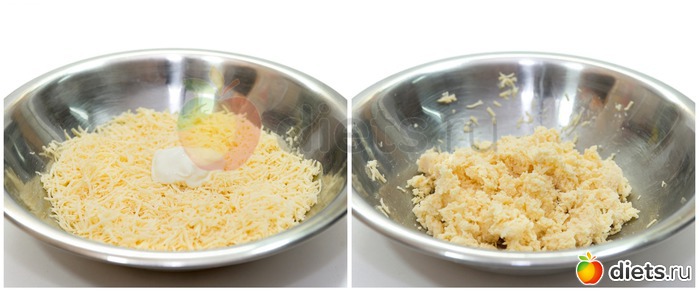 2. Сыр натереть на мелкой терке, добавить сметану, специи, если требуется – подсолить и тщательно вымесить.