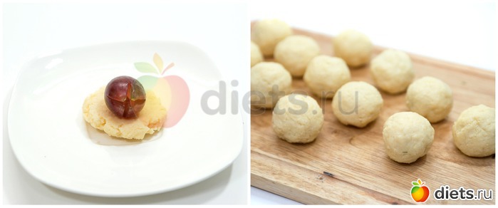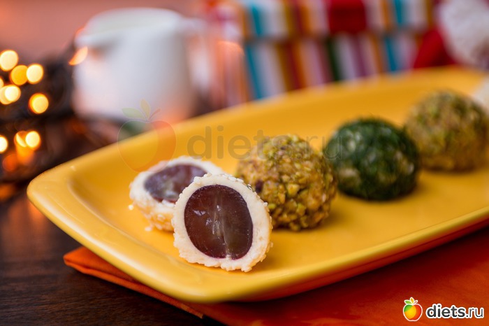 3. Разделить сырную массу на 12 равных частей (примерно по 18г), сформировать шарик, приплюснуть его, в центр уложить виноградину. Аккуратно защемляем края сырной массы и снова формируем шарик. То же самое проделываем с остальным виноградом.