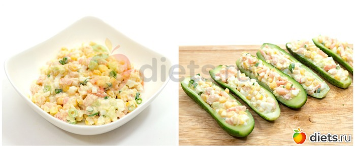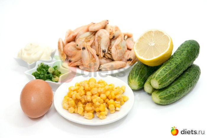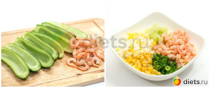 3. Яйцо отвариваем вкрутую, остужаем, чистим и нарезаем кубиками. Креветки также режем небольшими кусочками. Смешиваем креветки, яйцо, кукурузу, предварительно слив с неё жидкость, зеленый лук и добавляем немного измельченной мякоти огурца. Солим и перчим по вкусу.
