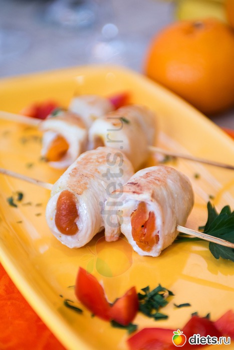 В 100 граммах куриных рулетиков с курагой содержится 187 ккал: белки 25 г, жиры 7 г, углеводы 6 г.