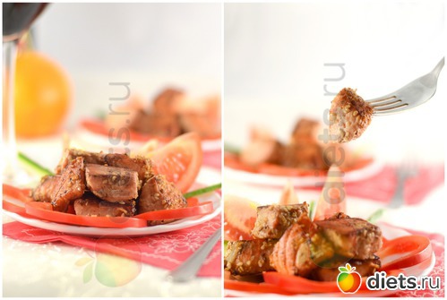 В 100 граммах готовых шашлычков с овощами содержится 97 ккал: белки 17 г, жиры 4 г, углеводы 2 г.