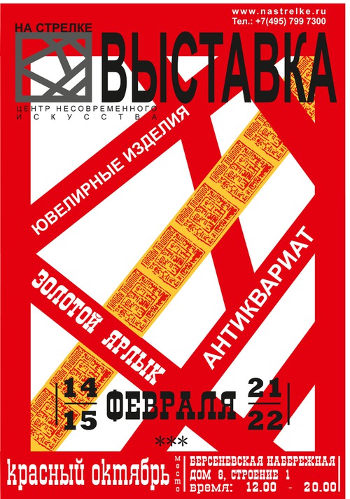 На площадке Центра несовременного искусства «На Стрелке» возникнет объединение работ ювелирного искусства и антиквариата XVIII - XX вв. «Золотой ярлык» станет уникальным событием как для широкой аудитории, так и для узкого круга специалистов.