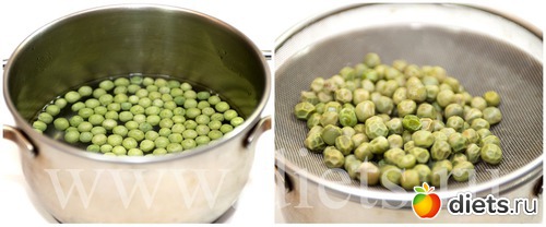 1. Зеленый горошек отварить до готовности в подсоленной воде. Откинуть на сито, чтобы стекла лишняя вода.