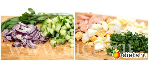 2. Огурец и петрушку промыть, обсушить. Лук и куриные яйца очистить. Мякоть рыбы отделить от костей. Огурец и яйцо порезать кубиками, петрушку измельчить, лук нарезать четверть кольцами.