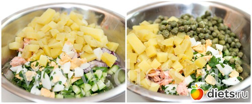 3. В миске смешиваем все ингредиенты, добавляем очищенный картофель, нарезанный небольшими кубиками и зеленый горошек.
