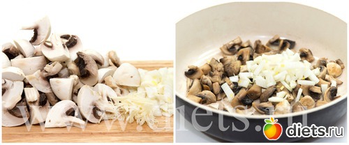 1. Грибы тщательно промыть, обсушить, очистить и нарезать крупными кусочками. Сковороду разогреть, переложить в неё шампиньоны, и обжаривать около 6 минут, когда из них выделится лишняя влага, сливаем её в отдельную миску. Затем добавляем в сковороду столовую ложку оливкового масла и заранее измельченный лук. Снова жарим все вместе около 5 минут, до золотистого цвета.
