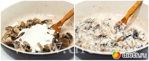 2. В миске смешиваем сметану и жидкость от грибов, подсаливаем по вкусу и добавляем в сковороду. Перемешиваем и тушим все вместе на небольшом огне ещё минут 5-6.
