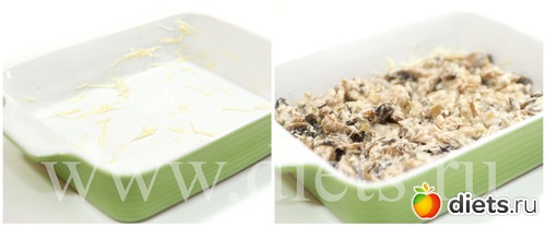 3. Форму для выпекания или специальные кокотницы для жульена смазываем заранее натертым на мелкой терке или пропущенным через пресс чесноком. Перекладываем в неё грибы с соусом.