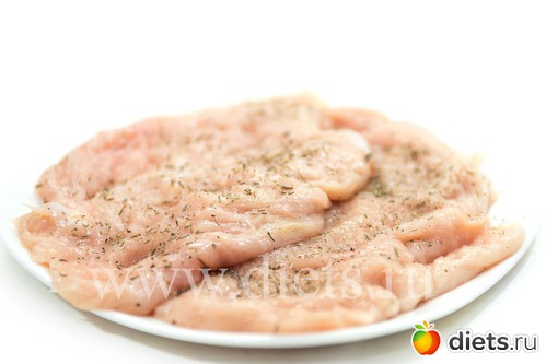 1. Филе куриной грудки промыть, обсушить и хорошенько отбить (для удобства можно положить грудку в целлофановый пакет и отбивать кухонным молоточком). После этого посолить и посыпать специями. Оставить на некоторое время.
