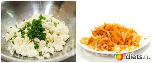 2. Тем временем зелень промыть и обсушить. Творог размять вилкой (если он слишком сухой, можно добавить немного натурального йогурта или нежирной сметаны), смешать с измельченной зеленью, посолить и поперчить по вкусу. Лук и морковь очистить, лук нарезать четверть кольцами, морковь натереть на крупной терке. В сковороде разогреть столовую ложку оливкового масла и обжарить в нем сначала лук, затем добавить морковь, и немного потушить все вместе под крышкой. Посолить по вкусу.