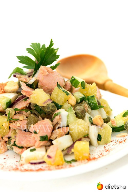 В 100 граммах готового салата содержится 114 ккал: белки 8 г, жиры 6 г, углеводы 7 г.