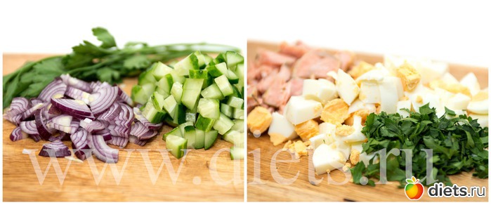 2. Огурец и петрушку промыть, обсушить. Лук и куриные яйца очистить. Мякоть рыбы отделить от костей. Огурец и яйцо порезать кубиками, петрушку измельчить, лук нарезать четверть кольцами.
