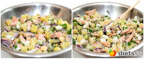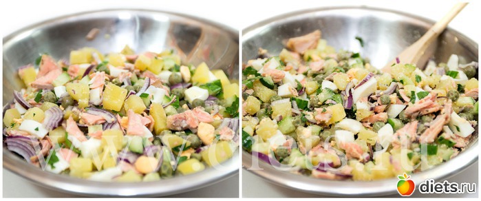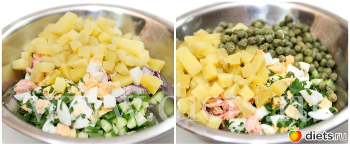 3. В миске смешиваем все ингредиенты, добавляем очищенный картофель, нарезанный небольшими кубиками и зеленый горошек.