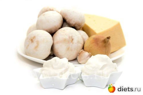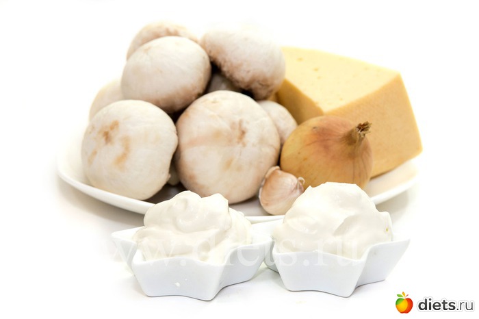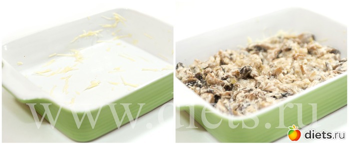 3. Форму для выпекания или специальные кокотницы для жульена смазываем заранее натертым на мелкой терке или пропущенным через пресс чесноком. Перекладываем в неё грибы с соусом.