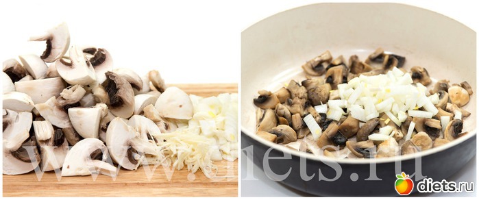 1. Грибы тщательно промыть, обсушить, очистить и нарезать крупными кусочками. Сковороду разогреть, переложить в неё шампиньоны, и обжаривать около 6 минут, когда из них выделится лишняя влага, сливаем её в отдельную миску. Затем добавляем в сковороду столовую ложку оливкового масла и заранее измельченный лук. Снова жарим все вместе около 5 минут, до золотистого цвета.