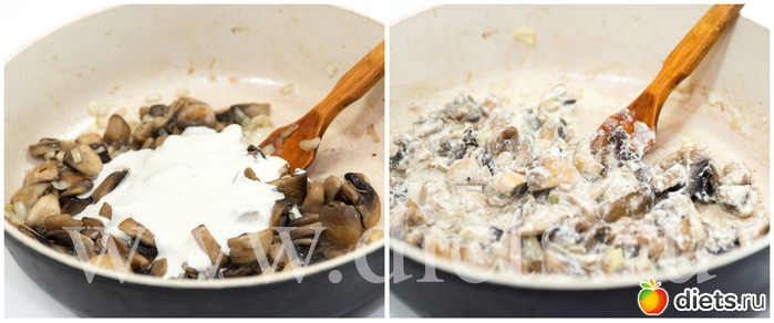 2. В миске смешиваем сметану и жидкость от грибов, подсаливаем по вкусу и добавляем в сковороду. Перемешиваем и тушим все вместе на небольшом огне ещё минут 5-6.