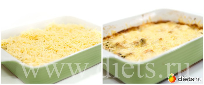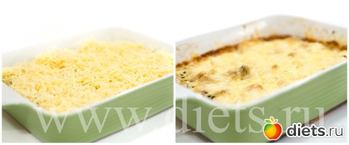 4. Посыпаем все натертым на мелкой терке сыром и ставим в заранее разогретую до 200 градусов духовку минут на 12-15, до образования аппетитной корочки.