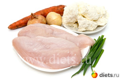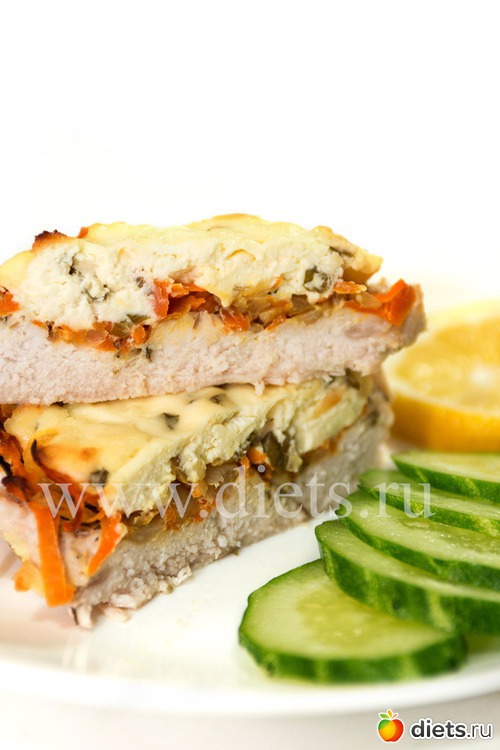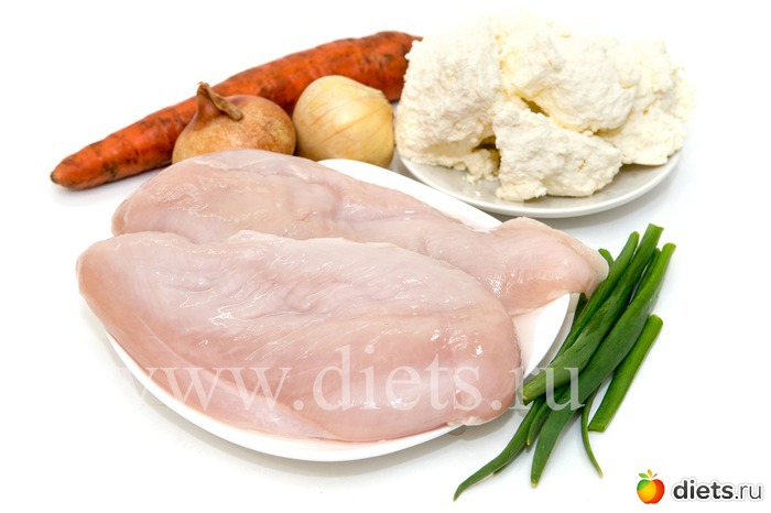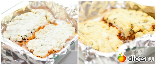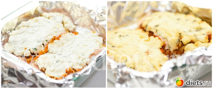 3. Теперь на куриную грудку выкладываем пережаренные морковку с луком, сверху ровным слоем распределяем творог с зеленью, по желанию, творог можно слегка смазать нежирной сметаной. Удобнее все это делать в заранее подготовленной и застеленной фольгой форме для выпекания. Ставим форму в разогретую до 180 градусов духовку минут на 25-30, до образования золотистой корочки.