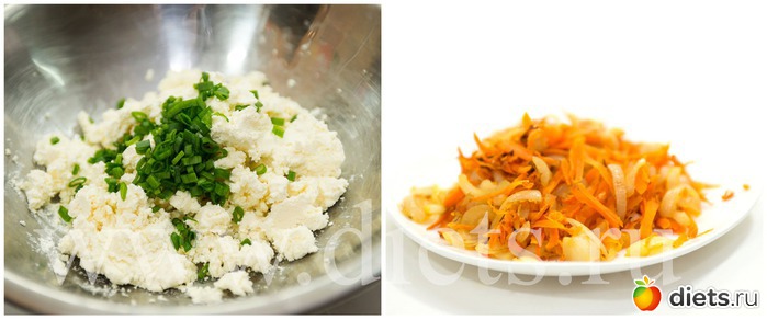2. Тем временем зелень промыть и обсушить. Творог размять вилкой (если он слишком сухой, можно добавить немного натурального йогурта или нежирной сметаны), смешать с измельченной зеленью, посолить и поперчить по вкусу. Лук и морковь очистить, лук нарезать четверть кольцами, морковь натереть на крупной терке. В сковороде разогреть столовую ложку оливкового масла и обжарить в нем сначала лук, затем добавить морковь, и немного потушить все вместе под крышкой. Посолить по вкусу.