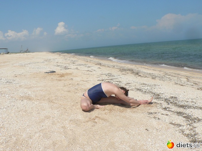 Не меняя положения ног, всем корпусом и прямыми руками потянитесь вперед. Зафиксируйте положение на 30 секунд.