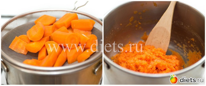 1. Морковку очистить, порезать крупными кусками и отварить до готовности. Взбить отварную морковь с помощью блендера до состояния пюре или пропустить через мясорубку.