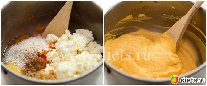 2. Добавить к морковному пюре творог, яйцо, сахар, щепотку соли, корицу и овсяную муку (можно заменить манкой). Снова все вместе взбить блендером, либо творог заранее пропустить через мясорубку.