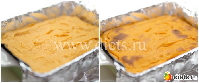 3. Форму для выпекания застелить фольгой и переложить в неё творожно-морковную массу. Выпекать запеканку в заранее разогретой до 180 градусов духовке 30 минут или до образования золотисто-коричневой корочки. Снять фольгу, после того, как запеканка остынет.