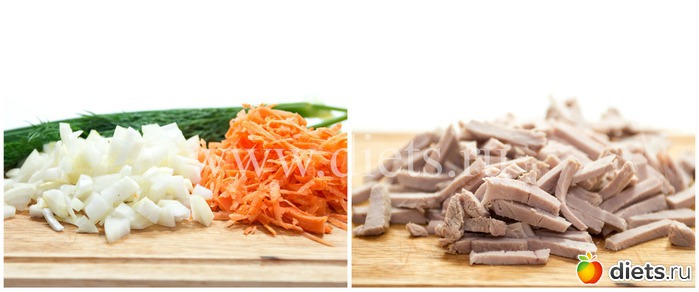 1. Подготовим овощи и мясо. Лук и морковь чистим, ополаскиваем. Морковь натираем на крупной терке, лук измельчаем, помидор бланшируем, снимаем кожицу и нарезаем кубиками (можно измельчить до состояния пюре в блендере). Отварное мясо нарезаем тонкими полосками.