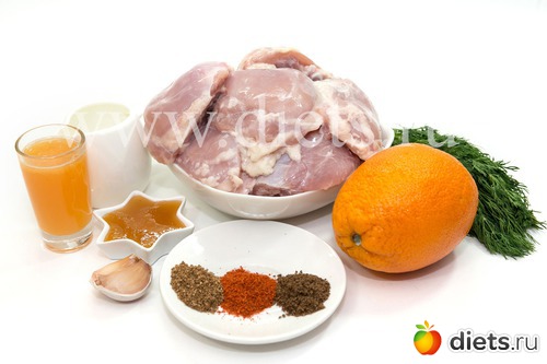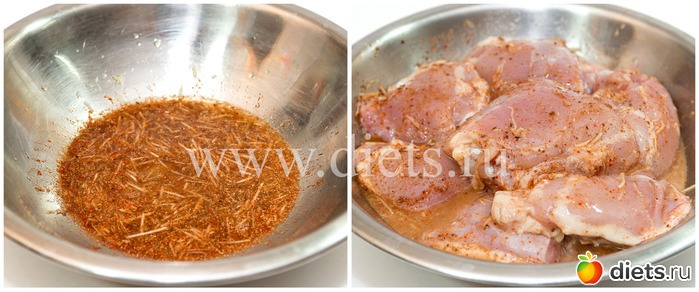 1. Приготовим маринад, для бедрышек. Для этого чеснок чистим и трем на мелкой терке, смешиваем его с медом, апельсиновым соком, кориандром, тмином, паприкой и чайной ложкой оливкового масла. Все тщательно перемешиваем. Курицу солим, перчим и погружаем в маринад полностью. Накрываем емкость пищевой пленкой и ставим в холодильник на 1 час.