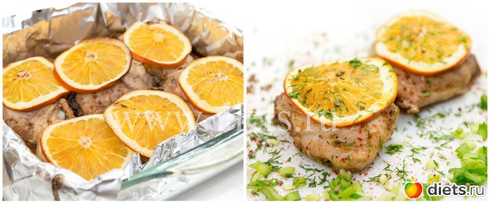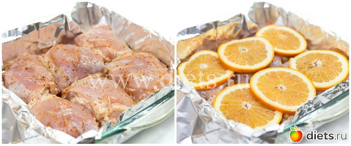 2. Жаропрочную форму застилаем фольгой и, по истечении времени, перекладываем в неё уже промариновавшиеся куриные бедрышки. Апельсин промываем, обсушиваем и нарезаем кружочками. Укладываем на каждое бедро по кружочку апельсина.