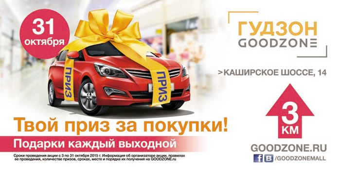 31 октября в ТРЦ «ГУДЗОН» - особый день! Свою работу начнет костюмированная фотозона в стиле Хэллоуин! Каждый покупатель при предъявлении чека от 1000 рублей сможет сделать фото в костюме и распечатать его на инстапринтере. Также в этот день состоится награждение победителей конкурса фотографий на тему «I love Goodzone». Самое главное событие дня - розыгрыш автомобиля, выступление шоу-балета «Страна ОЗ» и концерт группы «Фабрика».