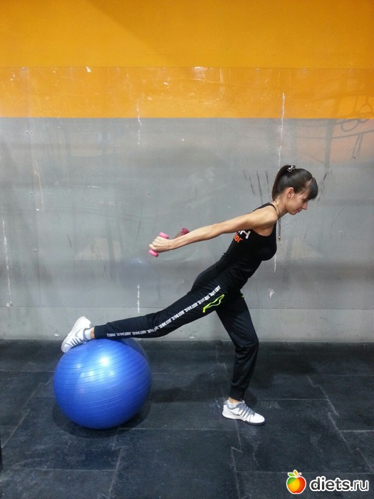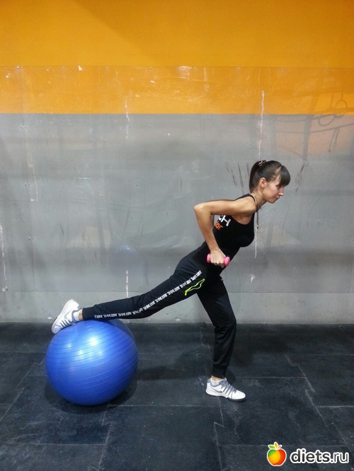 Правую руку сгибаем в локте и тянем гантель вниз, одновременно еще немного приподнимаем правую ногу. Возвращаемся в исходное положение. После 10 повторов ложимся на фитбол правым боком и выполняем упражнение еще 10 раз в зеркальном отражении.