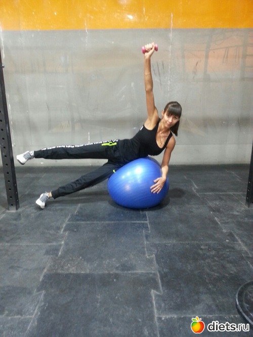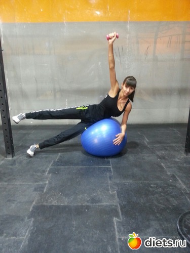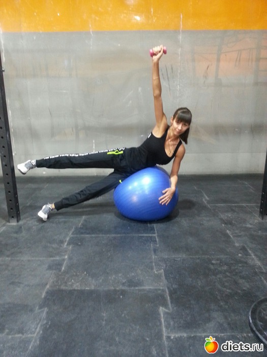 Исходное положение. Ложимся левым боком на фитбол. Для того чтобы легче было держать равновесие, вначале можно упереться прямыми ногами в стену Прямую правую ногу поднимаем вверх и располагаем параллельно полу. Левую руку кладем на фитбол, а прямую правую руку с гантелью поднимаем вверх. Ладонь смотрит вперед.