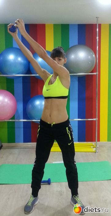 Исходное положение. Стоим прямо, ноги на ширине плеч. В прямых руках, поднятых вверх и чуть отведенных вправо вниз, удерживаем утяжелитель.