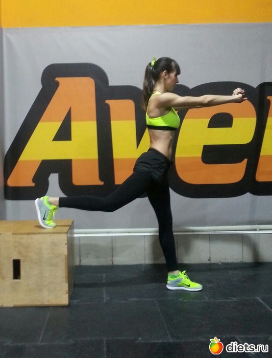 Теперь снова переместитесь и встаньте спиной к боксу в шаге от него. Правую прямую ногу отведите назад и зафиксируйте сверху на коробке. Выполните 10 приседаний на левой ноге. Затем поменяйте ноги - расположите на коробке левую прямую ногу. Выполните 10 таких же приседаний на правой ноге.
