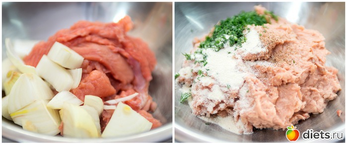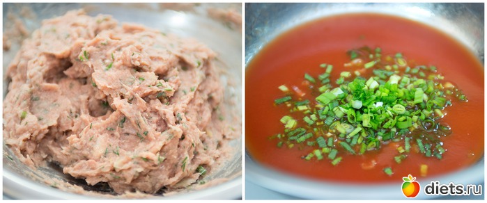 2. Тщательно перемешиваем фарш, даем немного постоять. Для соуса соединяем воду с томатной пастой, добавляем измельченный зеленый лук, соль, свежемолотый перец.