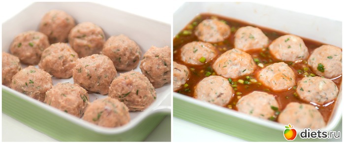 3. Смочив руки в воде, вылепливаем из фарша шарики среднего размера. Укладываем их в противень. Противень ставим на десять минут в разогретую до 180-200 градусов духовку, чтобы тефтели окрепли и не разваливались, когда будем заливать их соусом. После этого вливаем в форму томатный соус.