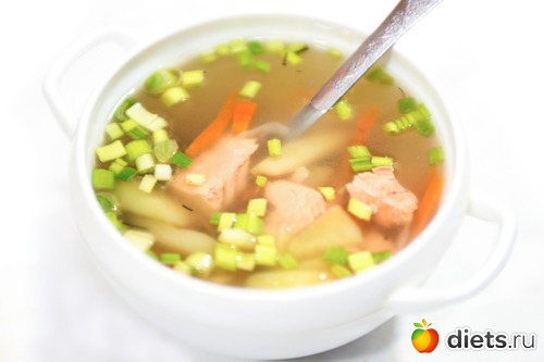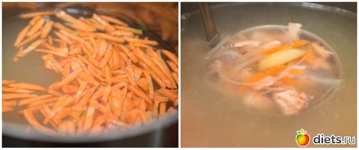 4. Морковь чистим и нарезаем тонкой соломкой. В бульон кидаем картофель и морковь, варим все вместе минут 20, практически до готовности овощей, после чего отправляем в суп лук и рыбу. Готовим суп ещё около 10 минут, далее газ выключаем, добавляем соль по вкусу, мелко порубленную зелень, свежемолотый перец, специи по вкусу. Накрыв кастрюлю крышкой, даем супу настояться около 10-15 минут.