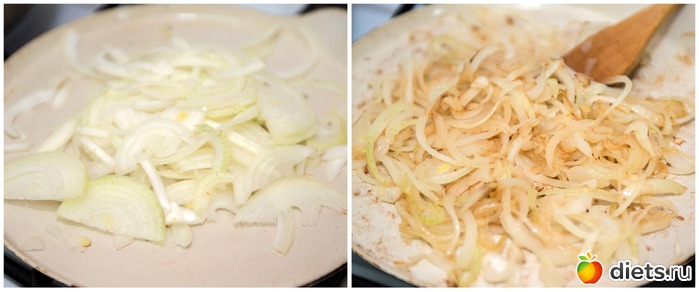2. Оставшуюся более крупную луковицу чистим, разрезаем на две части и нарезаем полукольцами, обжариваем до золотистого цвета в небольшом количестве оливкового масла.
