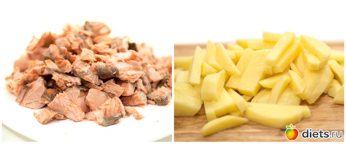 3. Пока лук жарится, нарежем очищенный картофель соломкой, а рыбу отделим от кожи и костей.