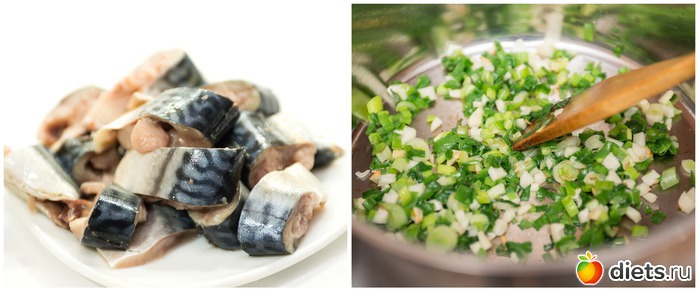 1. Рыбу потрошим, срезаем голову, хвост и плавники, тщательно промываем, удаляем хребет и, по возможности, все косточки. Режем рыбу кусочками. Зеленый лук также хорошенечко промываем и даем высохнуть. Шинкуем его. В глубокой сковороде или кастрюле разогреваем столовую ложку растительного масла и обжариваем в нем лук и нарезанный мелкими кубиками чеснок.
