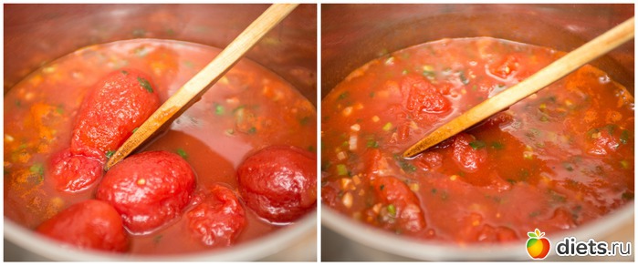 2. С томатов снимаем шкурки, вливаем их в кастрюлю к луку, тушим все вместе, раздавливая и помешивая несколько минут, добавляем базилик.