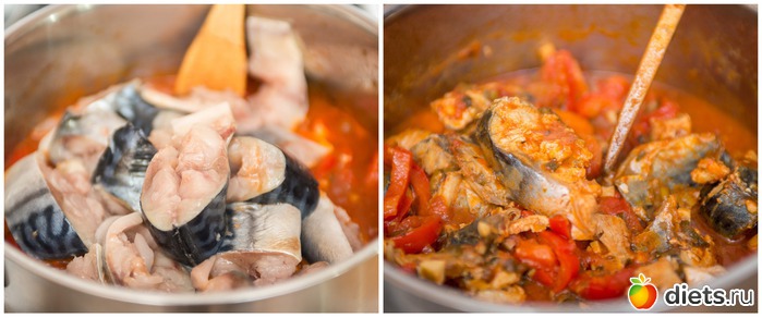 4. Кода морковь почти приготовится, кладем в кастрюлю кусочки рыбы. Готовим все вместе минут 15, периодически помешивая. В конце варки добавляем соль и свежемолотый черный перец, измельченную свежую зелень, перемешиваем и накрываем крышкой, даем настояться.