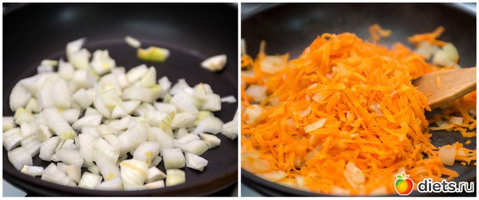 1. Лук очищаем и мелко шинкуем, пассируем в половинке столовой ложки разогретого оливкового масла. Морковь чистим и натираем в крупную терку, перекладываем к луку, добавляем немного воды, накрываем крышкой и готовим, пока не станет мягкой, на медленном огне.