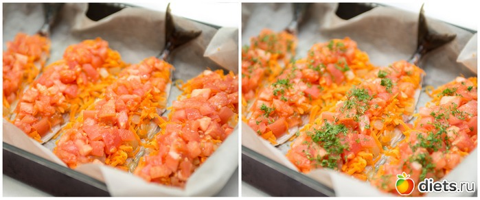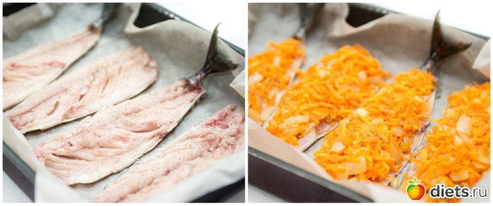 2. Тем временем, рыбку чистим, удаляем голову, внутренности и плавники, хвостик оставляем, тщательно промываем и обсушиваем. Разрезаем её на две части и аккуратно удаляем кости. Укладываем филе рыбки на противень, на фольгу, посыпаем солью, специями, базиликом и перцем по вкусу. Сверху на рыбу выкладываем морковно-луковую поджарку.