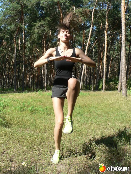 В течение минуты бегите на месте, высоко и выразительно поднимая колени перед собой. Каждый раз смену ноги сопровождайте сменой положения рук: то прямые руки поднимайте вверх, то опускайте вниз.