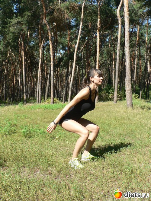 Шаг 1.Из положения стоя, ноги вместе, прямые руки подняты вверх, присядьте, приняв дополнительный упор на ладони рук.