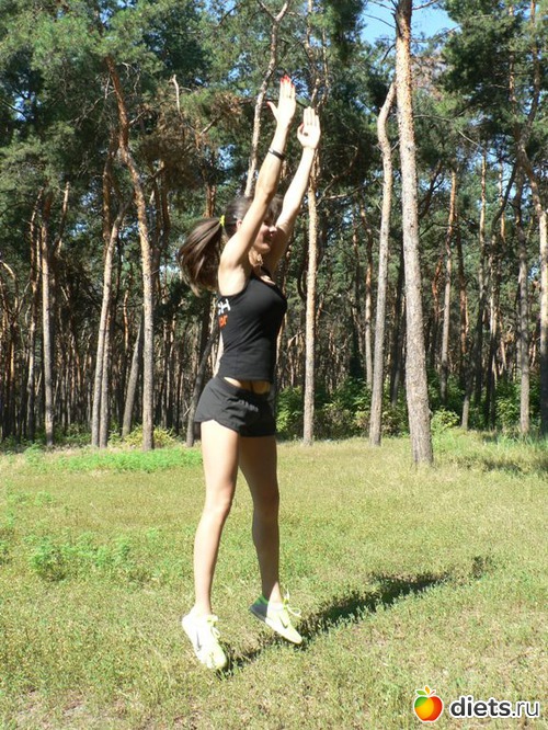 Шаг 4. Прыжком вверх выпрямитесь, прямые руки поднимите над головой.
