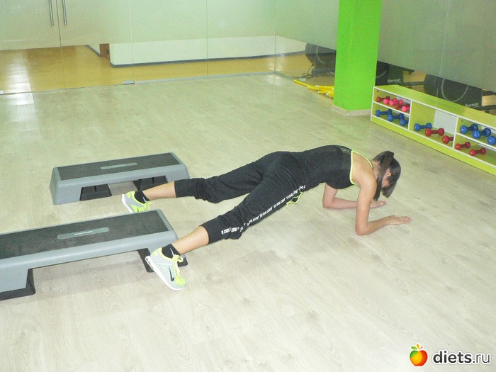 Для начала выполните 8-16 прямых отжиманий, приняв упор ладонями прямых рук на поверхность степа, а коленями ног – в пол. Усложнить данное упражнение можно тем, что одна рука размещается на поверхности степа, а другая на полу.