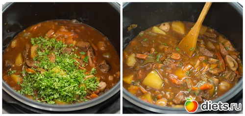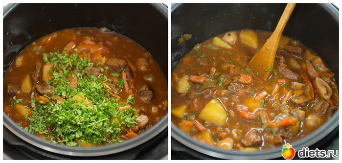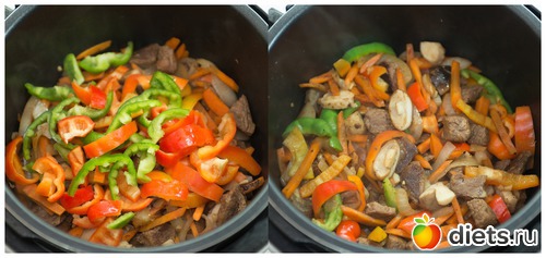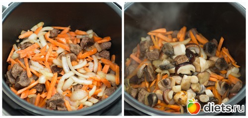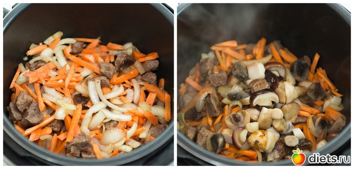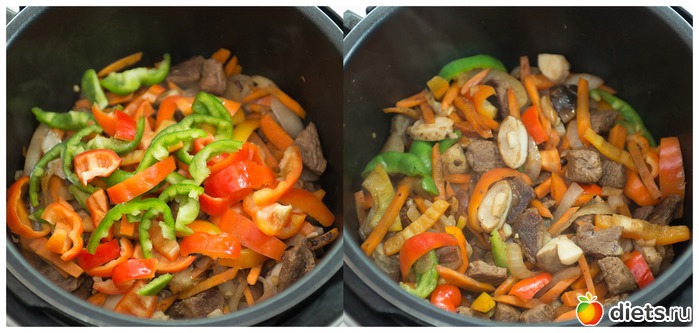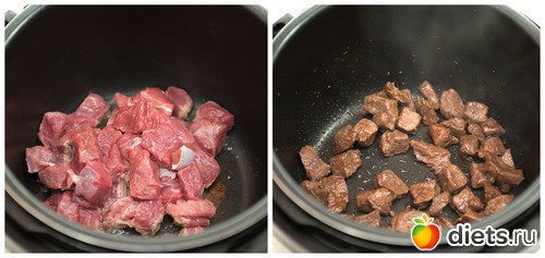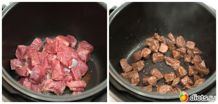 1. Говядину тщательно промываем, обсушиваем и нарезаем кусочками. Чашу мультиварки прогреваем, смазываем маслом. Обжариваем кусочки говядины до полного выпаривания жидкости.